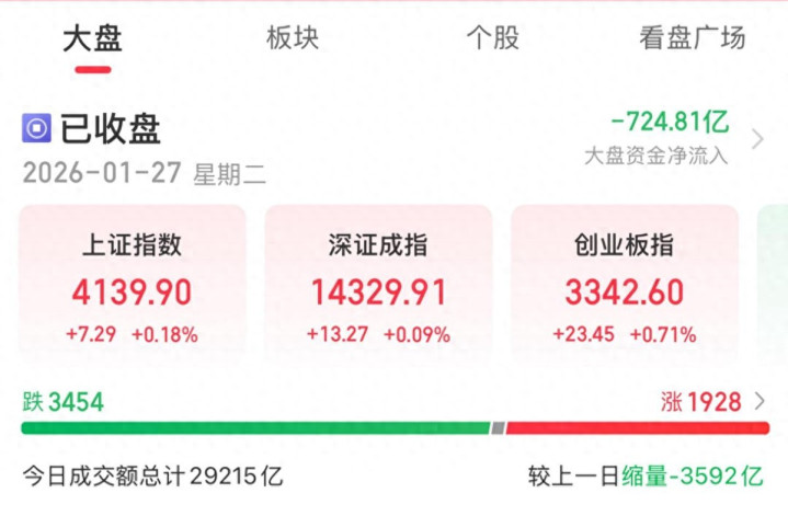 1月27日,A股缩量拉升,三大指数集体收涨,板块和个股多数下跌,芯片、保险和贵金属等板块领涨,煤炭、旅游和白酒等板块跌幅居前,盘面有两点值得关注: